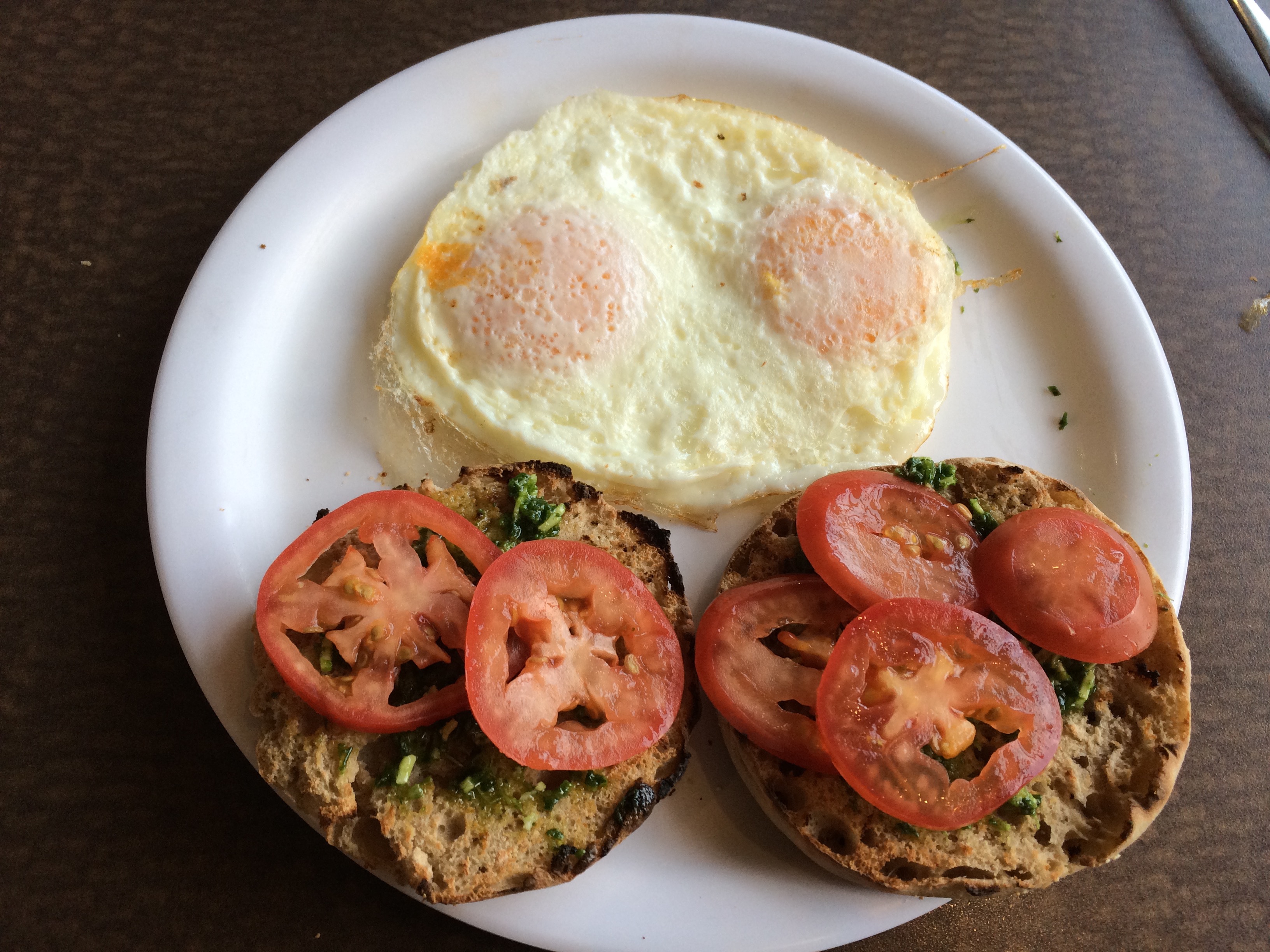 “I didn’t see that at the breakfast station,” my friend remarks, gazing longingly at my plate as I take a seat across from her. An open-faced English muffin, toasted to perfection and topped with creamy pesto, freshly sliced tomato, and a runny egg stares back at me. Dare I deem it yolk porn? On my friend’s plate sits a cold, overcooked, off-yellow lump of what appears to be some distant relative of an egg, a disgrace to the scramble itself.